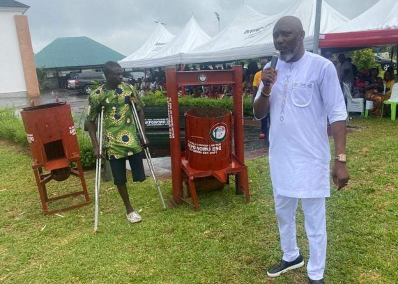 “One of the special beneficiaries today is a member of our great party, PDP. Sometimes last year, he was returning from a party unit meeting when he was knocked down by a vehicle, leading to the amputation of his left leg. I met with him to discuss the way forward. He requested for a palm oil milling machine. And I fulfilment of my promise, I presented the equipment today.