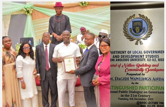 The Bomadi Council Chairman, Hon. Dagidi Rawlings Andaye has been honored with the “Award of Nation Building and Community Development” by the Obafemi Awolowo University (OAU), Ile-Ife.