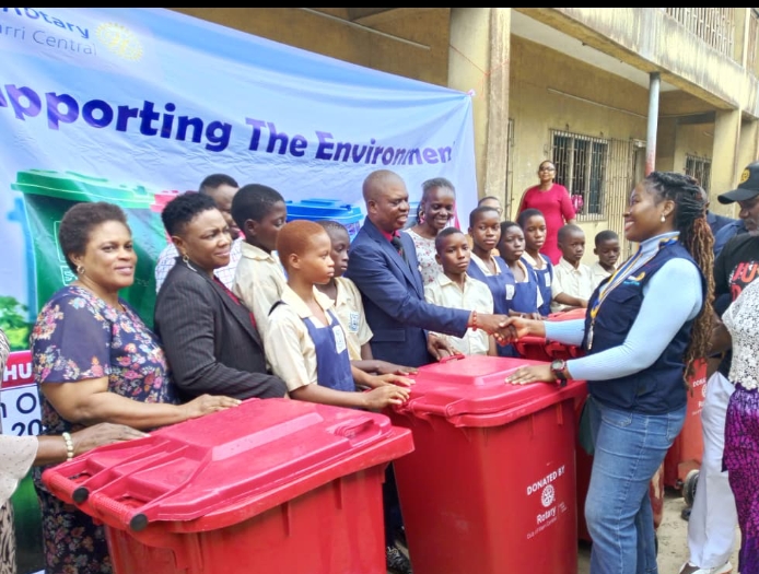 Rotary Club of Warri Central , District 9141 has Donated waste disposal Bins to Ekpan General Hospital and Ekapn Secondary school in Uvwie local Government area of Delta State.